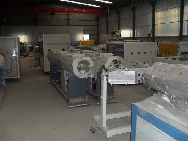 (2) PVC管材生産線擠出機部分:本機裝有定量加料裝置,使擠出量與加料量能夠匹配,確保制品穩定擠出。由於錐形螺杆的特點,加料段具有較大的直徑,對物料的傳熱面積和剪切速度比較大,有利於物料的塑化,計量段螺杆直徑小,減少瞭(le)傳熱面積和對熔體的剪切速度,使熔體能在較低的溫度下擠出。螺杆在機筒内旋轉時,将PVC混合料塑化後推向機頭,從而達到壓實、熔融、混煉均化;並(bìng)實現排氣、脫水之目的。加料裝置及螺杆驅動裝置採用變頻調速,可實現同步調速